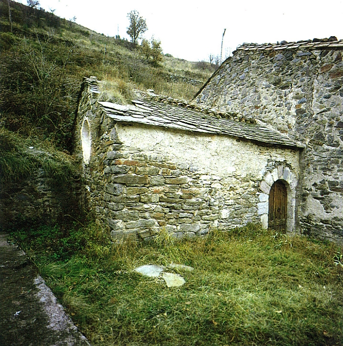 La porta d’entrada, coberta amb un arc adovellat, és oberta a la façana sud-oriental i encara serveix d’accés al temple. L’única finestra que té aquest edifici és de doble esqueixada i dona a la façana sud-occidental.
