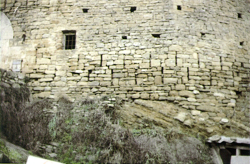 Detall dels murs amb espitlleres que formen el seu clos fortificat.