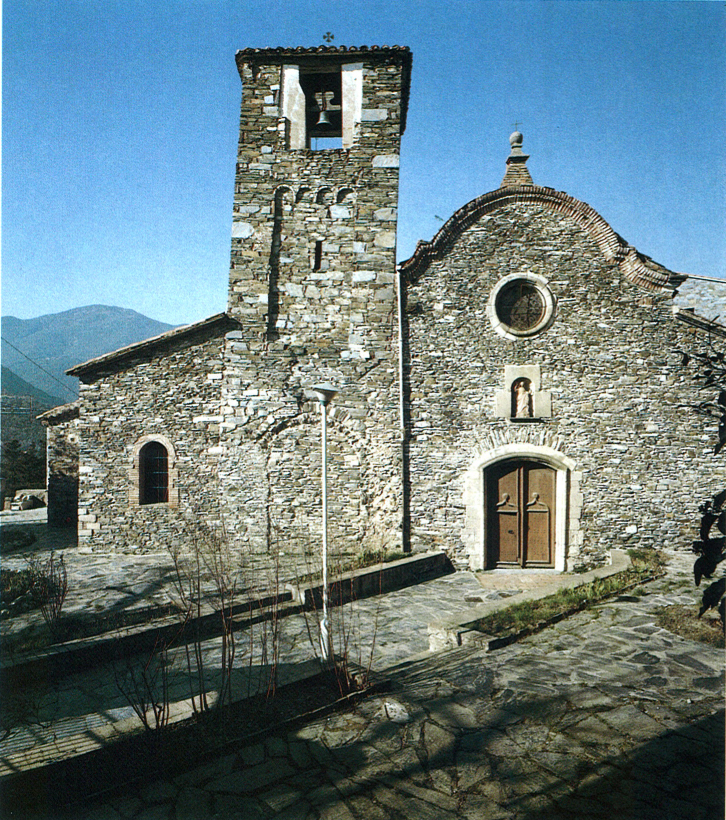 Façana de l’església, que conserva d’època romànica l’antic campanar ornat amb bandes i arcuacions llombardes.