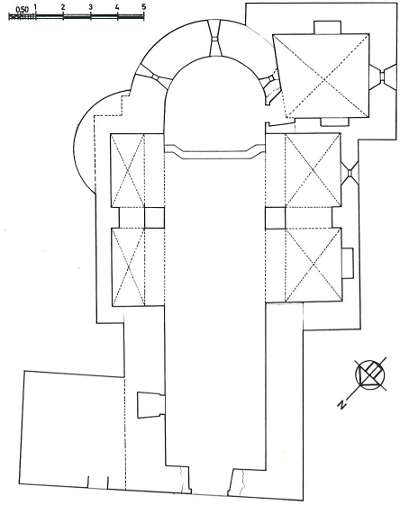 Planta de l’església, a escala 1:200. És un edifici d’una nau amb un absis quadrat, molt alterada i en estat ruïnós.