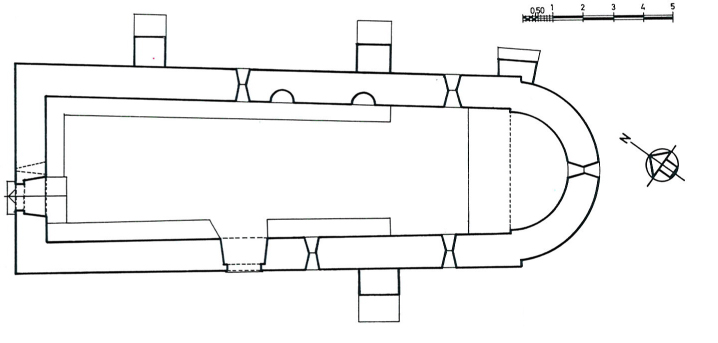 Planta de la capella de Sant Ponç, extraordinàriament allargada i sensiblement trapezial.