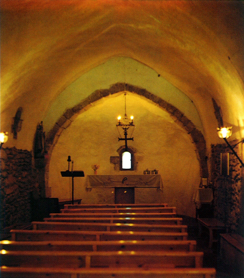 Interior de la capella, amb la volta molt apuntada i l’absis matusserament unit a la nau.