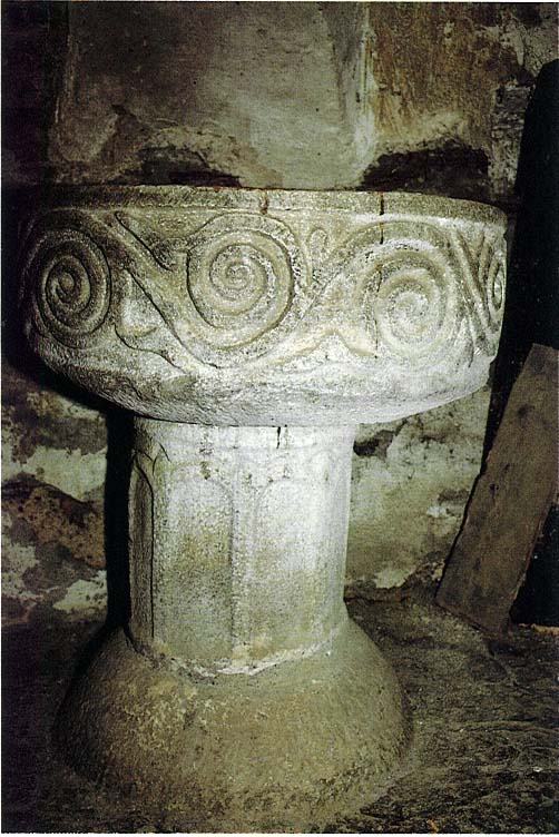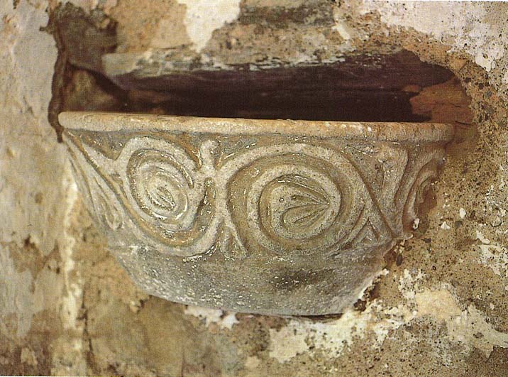 Pica baptismal, conservada al baptisteri, adossat a la capella de tramuntana. La seva decoració té el seu origen en l’art oriental, possiblement transmès a través de l’art bizantí i islàmic.