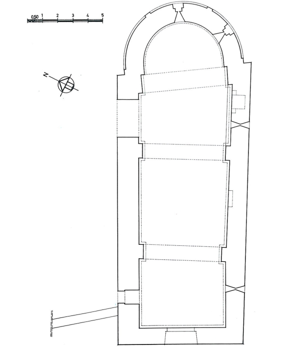 Planta, a escala 1:200, de l’església, amb una àmplia nau amb dos arcs torals, rematada vers llevant per un absis semicircular. Hom hi pot observar el pas obert al seu mur de tramuntana, la funcionalitat del qual ens és desconeguda.