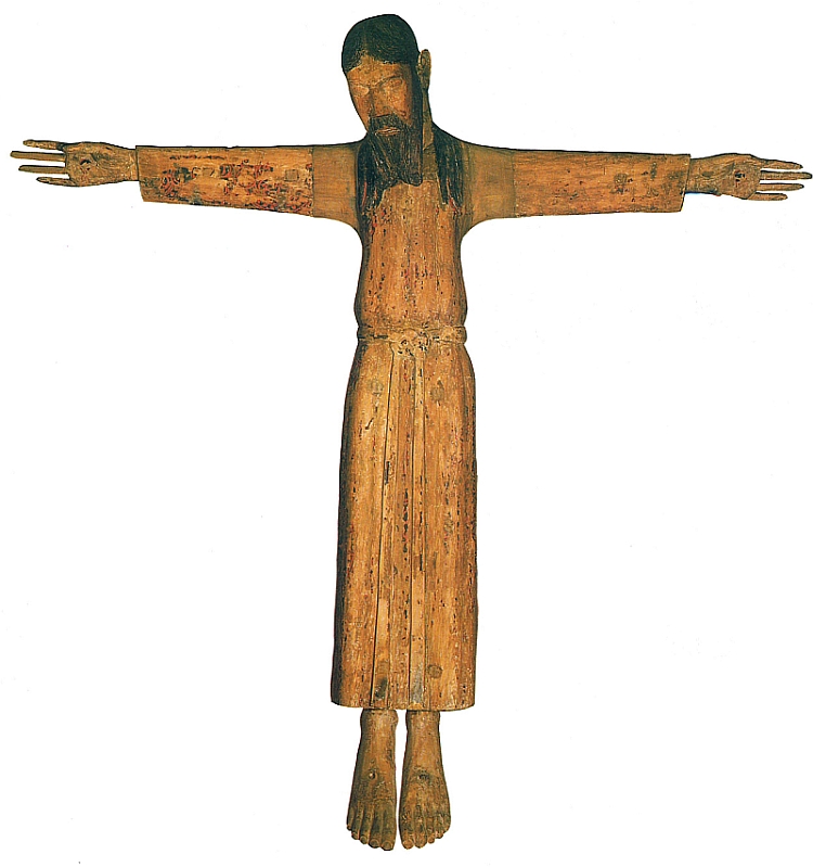Creu que originàriament acompanyava la majestat, avui aparellada amb un altre Crist que no hi correspon. Aquesta creu, que fou serrada, fa 107 cm d’alt per 98 cm d’envergadura.