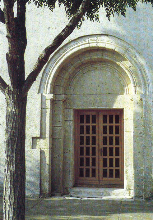 Porta d’entrada, oberta al mur de migjorn. Té tres arcs en gradació, tot i que, segons la seva estructura, sembla que fou projectada perquè tingués una arquivolta més.