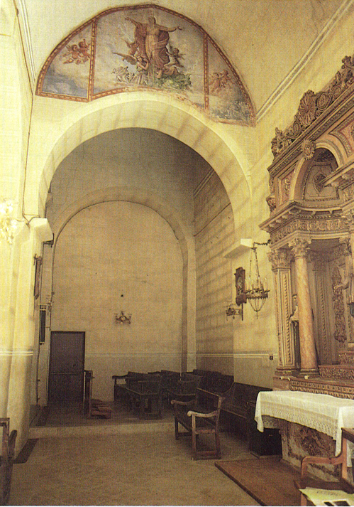 Un aspecte de l’interior de l’església, amb l’arc que obre la nau lateral al fals transsepte. Cal assenyalar la forma ultrapassada dels arcs i les grosses impostes bisellades, que coronen els pilars.