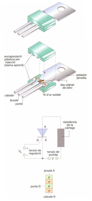 alternades, generalment de silici, proveït de tres elèctrodes: ànode, càtode i porta o elèctrode de control.