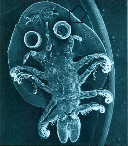 Cara ventral del branquiür Argulus vist al microscopi electrònic d’escandallatge (× 8), mostrant les diferents parts del cos. La sageta indica la posició dels discs suctors per mitjà dels quals es fixa al cos del peix hoste. De cos gairebé transparent i d’aproximadament 1 cm de llargada, hom pot veure aquests organismes en grans quantitats damunt d’un mateix peix, en el qual sovint canvien de posició.