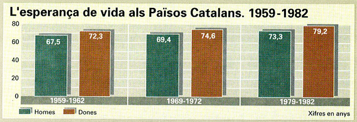Entre els anys 1960 i 1981, l’esperança de vida dels homes va augmentar al voltant de 5,8 anys, i la de les dones en 6,8 anys. Una manera intuïtiva de copsar què va representar aquest procés i els seus efectes sobre altres aspectes demogràfics és veure quin és el percentatge de nascuts, en aquest cas referit a la població masculina de Catalunya, que arribarien vius a diferentes edats segons el nivell de mortalitat del 1960 i el del 1981. Amb la mortalitat del principi dels anys seixanta, el 95,1% dels nascuts arribaria a complir 15 anys, el 70,1% sobreviuria als 65 anys i l’11,2% assoliria els 85 anys, mentre que, amb la mortalitat del començament dels vuitanta, aquests percentatges augmenten fins el 97,6%, el 79,2% i el 22,9%, respectivament. Òbviament, aquest augment de les probabilitats de sobreviure incideix sobre l’estructura per edats de la població, ja que un major nombre d’individus arriben a edats avançades i, a més, viuen més anys.