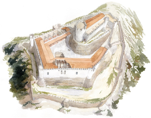 Restitució hipotètica de l’estat de la fortalesa a mitjan segle XIV, quan s’havia transformat en un castell residencial.