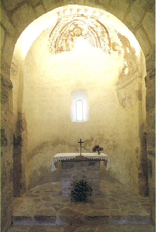 Vista de l’interior de l’absis central de l’església, amb algunes restes de les pintures murals romàniques que la decoraven.