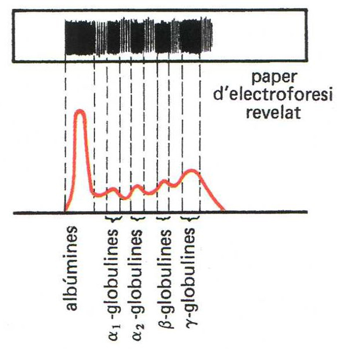 Electrofòresi de proteïnes sèriques: les diferents fraccions se separen al llarg de la banda del paper revelat i amb el densitòmetre hom obtè la gràfica de composició