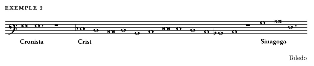 Existeix, també, el model castellà amb tres cordes de recitació situades a distància de 5a i 8a. Ha estat transmès en dues versions. La primera (exemple 2), conservada a l’arxiu de la catedral de Toledo, és del final del segle XV, i les tres cordes de recitació són do-sol-do. La segona (exemple 3) apareix en un document sense signar del segle XVI conservat al monestir d’El Escorial, amb les cordes de recitació re-la-re.