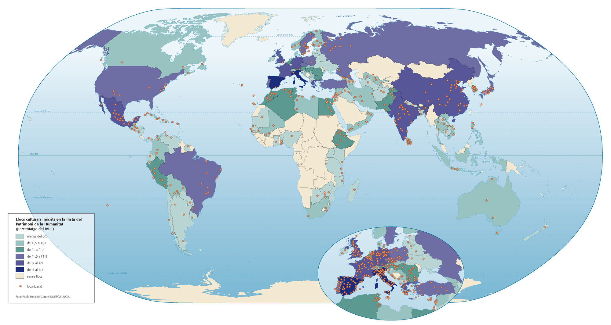 El Patrimoni de la Humanitat es distribueix pels cinc continents de manera diferent: 103 a Àfrica (30 de naturals i 64 de culturals), 138 a Amèrica (48 i 90 respectivament), 164 a Àsia (28 i 136), 330 a Europa (32 i 298) i 18 a Oceania (tots naturals). Els estats amb un major nombre d’inscripcions són europeus, i dins d’Europa ocupen els primers llocs Espanya (37), Itàlia (37), França (28), Alemanya (27) i la Gran Bretanya (25). Pel que fa a la resta d’estats del món, destaquen la Xina (30), l’Índia (24), Mèxic (24) i els Estats Units (18). En la llista és evident el pes de la civilització occidental, de tradició cristianojueva, encara que creix l’atenció dirigida a altres cultures, com per exemple la xinesa, la japonesa, la musulmana, la hindú o la budista. Sembla clar que, en aquesta situació, influeix no solament l’actual prevalença política, sinó també el procés de presentació i selecció dels béns a declarar i elegir, tot i que no hi ha dubte que s’està produint l’aproximació a un cert equilibri entre les diverses civilitzacions i cultures.
