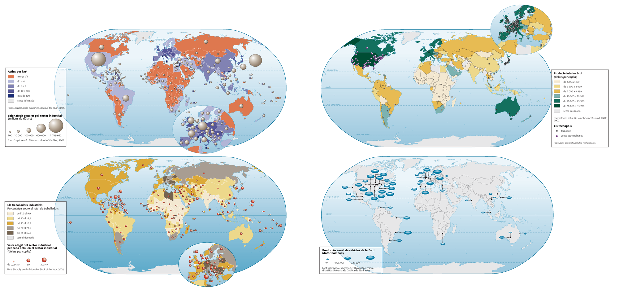 Des de mitjan segle XX s’ha produït una nova expansió territorial de l’activitat industrial més enllà dels clàssics països industrials d’Europa i l’Amèrica del Nord. Aquesta expansió, però, no ha arribat encara a tots els estats ni, dins d’aquests, a tots els territoris, com de fet ho posa en relleu el primer mapa, en què el volum total de treballadors es relaciona amb l'extensió territorial de cada Estat en comparació amb el volum de producció industrial.