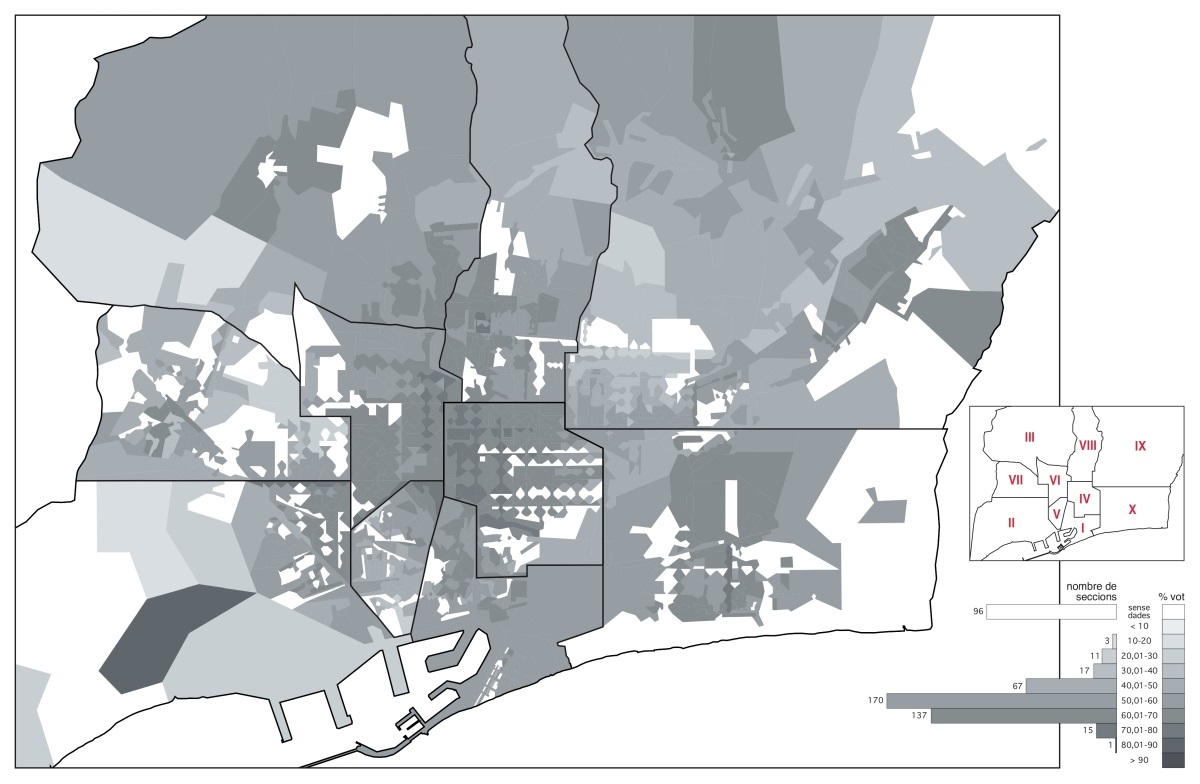 | Percentatge de participació de cada secció electoral: vota el 56,7% dels electors. 535.179 electors i 303.365 votants en 976 seccions (19.400 votants més, estimats per al conjunt de 57 seccions contigües del districte IV) | ![]() |