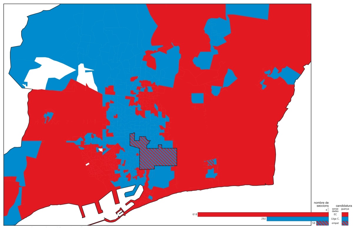 | Resultat de la victòria. Vot a l’Esquerra Republicana de Catalunya. Percentatges sobre el cens 97.627; votants en 517 seccions: 37% del cens; 59,9% del total de votants | ![]() |