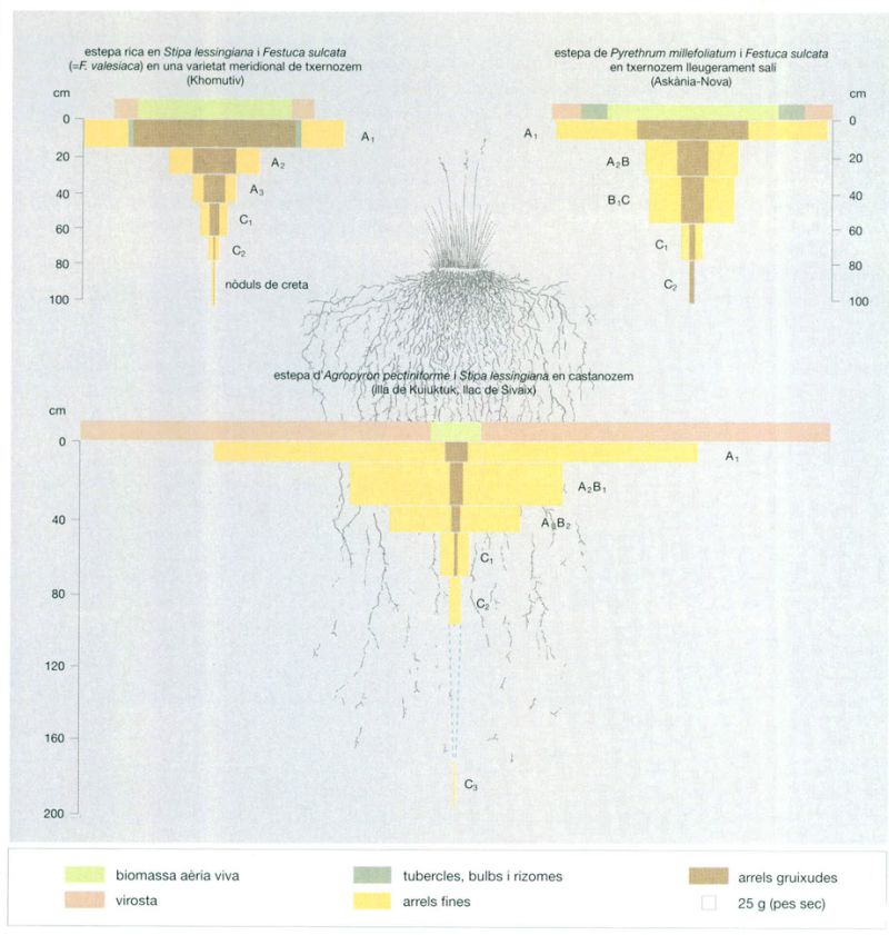La massa radicular de les comunitats estepàries es concentra, sobretot, als primers horitzons del sòl, i a mesura que es va guanyant profunditat es va fent més escassa. A més, a les praderies i, especialment, a les estepes, aquesta massa radicular subterrània representa un volum molt més gran que el de la fitomassa aèria, cosa que es veu clarament en representar esquemàticament una poàcia típica d’estepa (a dalt, al centre). A les estepes d’Askània-Nova, es troben bulbs per sobre de la superfície de sòl a causa de la presència de Poa bulbosa. La major part dels hidrats de carboni i altres productes que es formen per fotosíntesi a les fulles i a les tiges verdes van a parar a les arrels. Durant el període de creixement màxim de la fitomassa verda, només un 30% de la producció és destinada a l’arrel, però a mesura que s’alenteix el creixement de les parts aèries, aquest percentatge va augmentant i pot arribar fins al 90%. No és sorprenent, per tant, que el sistema radical creixi notablement. A les estepes de la Sibèria oriental i a les del Kazakhstan, per exemple, el valor de la producció de les arrels pot assolir en un mes les 10 t/ha. Més tard, el mateix sistema radical o les parts aèries aprofiten les substàncies emmagatzemades per créixer. Des de l’arrel, l’aigua i els productes nutritius són transportats ràpidament cap a la part aèria per estimular la fotosíntesi. Tanmateix, el flux d’hidrats de carboni que passa de les arrels a les parts verdes no ultrapassa el 6% del flux que va de la part aèria a la subterrània. La reserva de substàncies nutritives roman intacta excepte en casos de necessitat extrems.