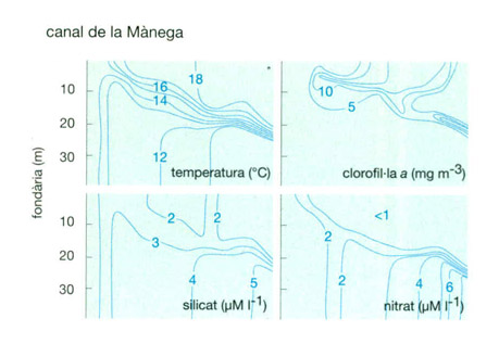 En el gràfic, corresponent a una presa de mostres feta del 19 al 21 de setembre de 1985, s’indiquen també els llocs on dominen determinats gèneres o espècies de diatomees de comportament diferent en relació amb la riquesa de nutrients. Thalassiosira es multiplica ràpidament (màxims de clorofil·la) i serveix d’aliment als copèpodes; a l’extrem contrari, Planktoniella, tot i tenir una organització semblant, es multiplica més lentament i té una mena de “faldilles” que en dificulten la ingestió, i és més freqüent mar enfora, on decau la intensitat de l’aflorament.