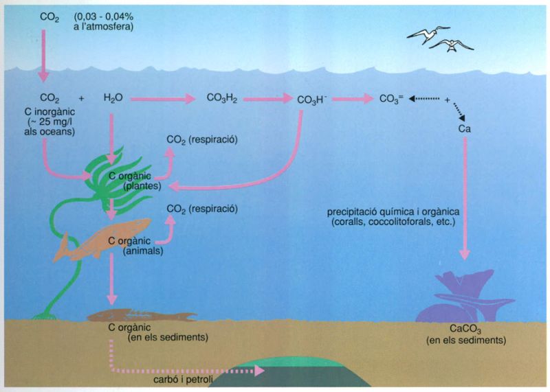 La circulació del carboni a escala global és un bon exemple de la influència mútua entre els cicles globals dels diferents elements (en aquest cas el calci) presents al medi i de la intervenció dels diferents tipus d’organismes en cadascun. Una part del carboni present a l’atmosfera en forma de diòxid de carboni pot combinar-se amb el calci i precipitar en estructures orgàniques persistents, com són els baixos de corall, els exosquelets de les coccolitoforals, etc., o perdre’s en els sediments. Una altra part, després d’haver passat com a carboni orgànic a través de les cadenes tròfiques, també pot acabar al sediment però en forma de carboni orgànic de la necromassa.