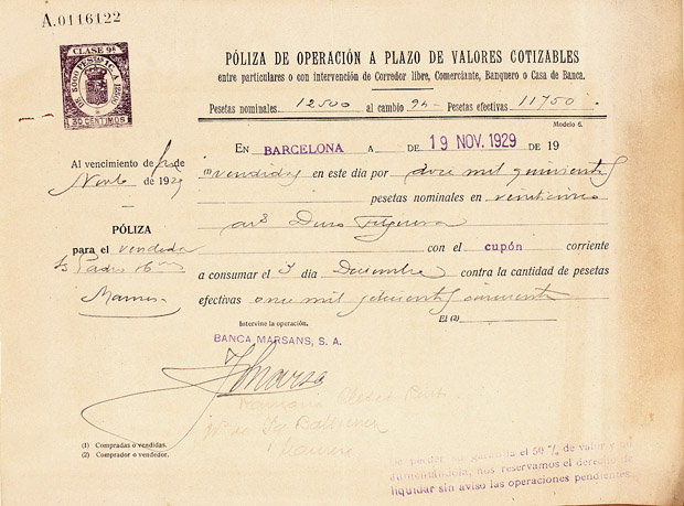 Barcelona fou el mercat de capitals més gran d’Espanya fins el 1936. A dalt, pòlissa d’operació a termini. A baix, pòlissa per operació de dobla.
