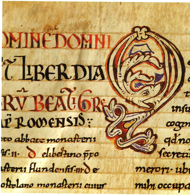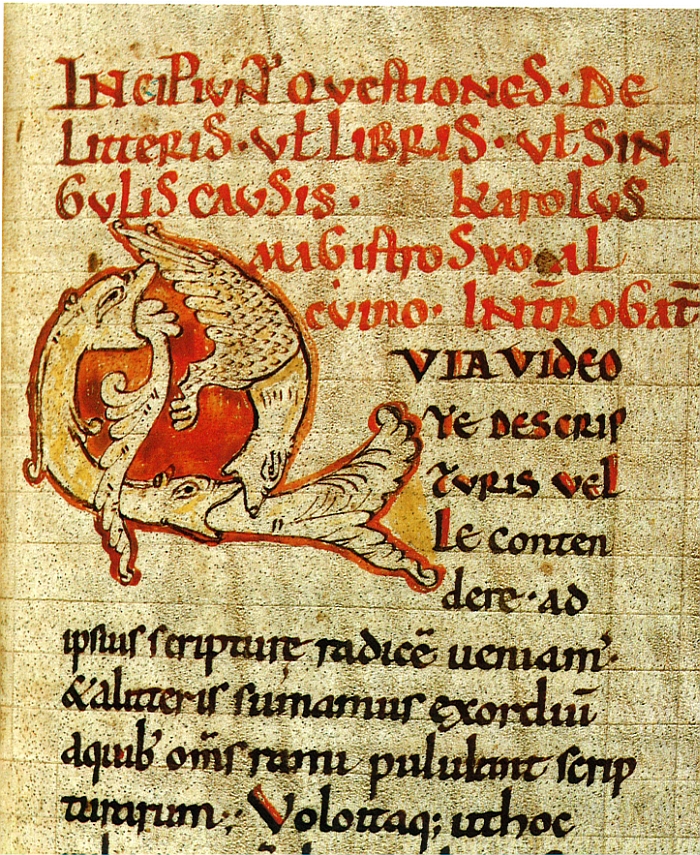 Un detall del foli 3v, amb una lletra capital “Q”, molt ornamentada, de determinació curvilínia i amb un cap d’animal.