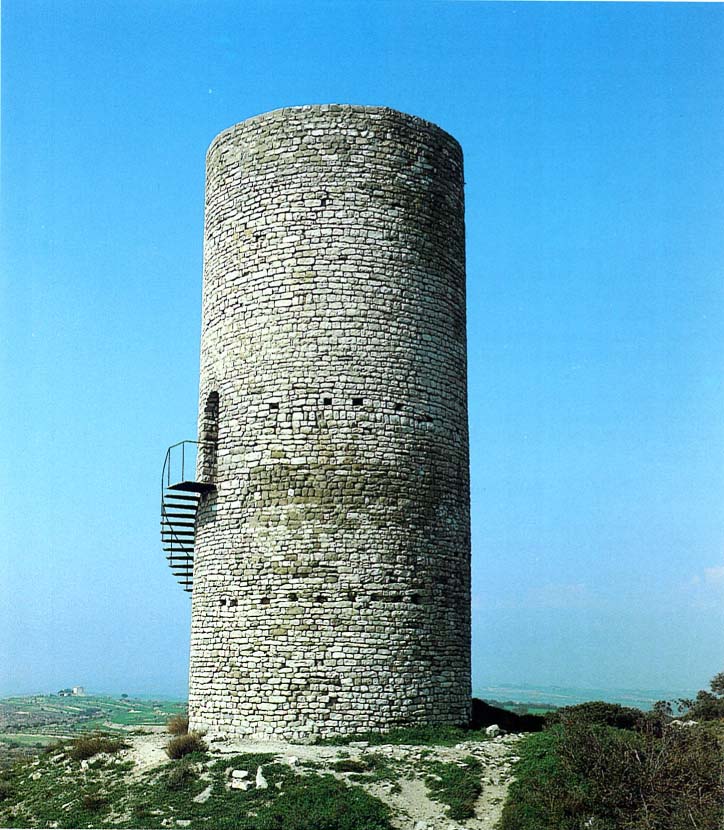La porta és a 6 m d’alçada, a la banda sud. Presenta un arc de mig punt que es projecta formant una mena de petita volta de canó a través del mur. La torre té tres nivells. L’inferior, que és cec, era cobert per una volta semiesfèrica o cúpula, avui en gran part derruïda, i tenia un ull de bou central que permetia accedir-hi. El segon nivell, on s’obria la porta, té una cúpula semblant, feta amb pedres més allargassades que les dels murs que cobreix. Aquesta cúpula serveix de base al terra del tercer nivell, el qual era de petites lloses en part cobertes amb calç. L’accés al tercer nivell es fa per un forat de forma triangular situat al costat nord de la cúpula. En aquest pas estret (30 cm) es feren quatre graons, situats a l’extradós de la cúpula, que permeten de superar els 90 cm de desnivell que hi ha; un petit forat a manera de desguàs situat al nivell del terra pel costat oest és l’única obertura de la cambra del tercer nivell, als murs de la qual hi ha buidats un petit armariet i una renglera de forats de la bastida que trenquen en part l’austera monotonia de les parets. La volta del tercer nivell i l’accés a la terrassa superior —que abans de la restauració estava perduda— són idèntics als de la planta de sota. L’obertura d’accés a la terrassa, en aquest cas, és a la banda occidental.