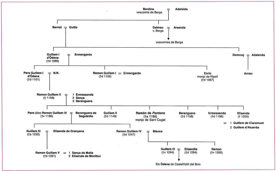 Les primeres notícies que es coneixen d’un senyor del castell d’Òdena daten de l’any 1040, en què es feu un conveni entre els germans Domnuç Bernat i Guillem Bernat d’Òdena pel qual es feien diverses promeses sobre l’honor, el feu i l’alou que ambdós tenien al castell d’Òdena. Guillem era l’hereu i fou qui continuà en el domini del castell d’Òdena. Per una permuta que tots dos germans feren l’any 1054 dels béns que havien rebut dels seus pares, se sap que aquests s’anomenaven Bernat i Guilla. És molt probable que Guillem i Domnuç Bernat fossin fills d’un fill del vescomte Bardina anomenat Bernat, que es documenta l’any 1019 juntament amb el seu germà Dalmau, vescomte, i la seva mare Adalais, actuant com a marmessors de Bardina donant els béns que el difunt havia deixat a Sant Cugat del Vallès. Aquesta suposició es basa en el fet que el pare de tots dos germans es digués Bernat, i que Domnuç Bernat tingués uns béns al delta del riu Llobregat que havien estat del vescomte Bardina; a més, és possible que uns béns del terme de Sant Fruitós de Bages que també havien estat dels vescomtes del Berguedà, Guifred i Quixol, i posteriorment del vescomte Bardina, passessin a Domnuç Bernat o a Dalmau, vescomte.