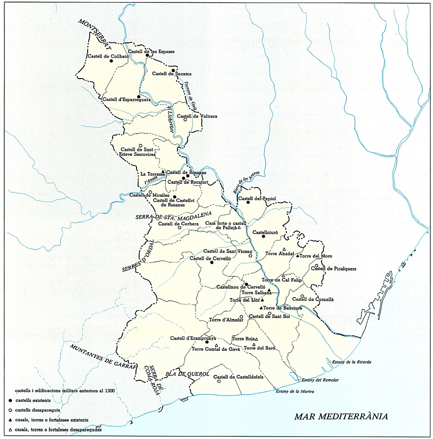 Mapa dels castells i fortaleses del Baix Llobregat anteriors al 1300.