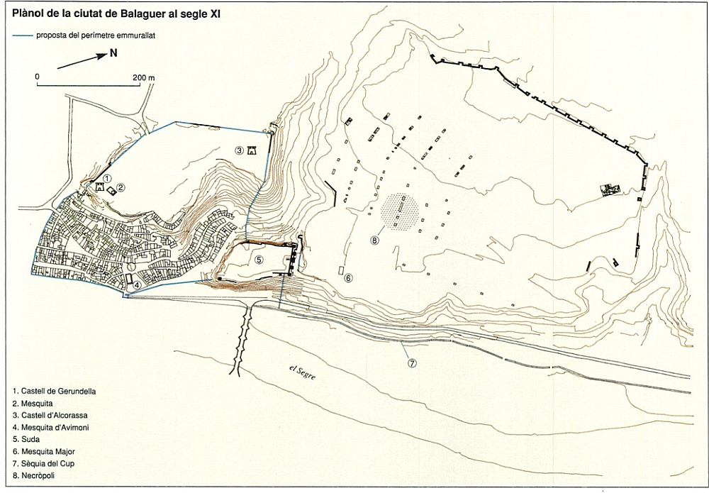 Balaguer també ha conservat restes de la muralla islàmica del final del segle X i del segle XI. Al barri del pla d’Almatà encara hi ha les antigues muralles, malgrat que presenten reformes posteriors. La documentació llatina revela l’existència de dos castells o zones fortificades a més de les ja conegudes: el castell de la Gerundella, que domina el barranc del mateix nom, i que per tant cal situar a l’extrem sud del barri del Firal, pròxim a l’església de Santa Maria, i el castell d’Alcorassa. Pel que fa a aquest últim, de clar topònim àrab, ‘qawraya’, sembla que no pot haver-hi dubtes a l’hora de situar-lo al sector nord del barri del Firal, ja que la documentació dels segles XIV-XV situa la porta d’Alcarraz o Alcoraz tancant el barranc sota el castell. Les úniques restes que es conserven de la muralla islàmica que tancaria tot el conjunt urbà són al tram de muralla del Firal. També hi ha restes d’una o dues filades (d’una longitud de 21 m) a la part exterior de la muralla del sector del cementiri actual, del segle XIV. Pel que fa a la resta, només es poden fer hipòtesis a partir de l’estudi de la parcel·lació actual, però tot indica que al final del segle XI la ciutat ocupava una extensió aproximada de 33 ha. La ciutat, segons la documentació llatina, era perfectament organitzada. Així, en la concòrdia del 1097 entre Ermengol V comte d’Urgell i el vescomte Guerau Ponç II de Cabrera, es parla de “..ipsas casas de ipsa civitate, ipso banies vel de ipsos forns, vel de ipsos mercats, vel de ipsas tenas, et de ipsas lezdas, vel de ipsos decimos, vel de ipsas naves, vel de ipsos molendinos, vel de ipsos alfonacs, vel de ipsas portas ”.