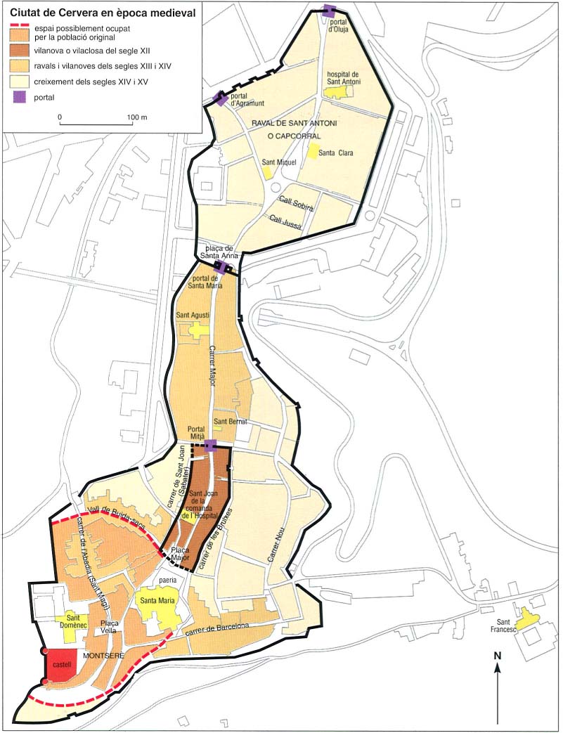 Bàsicament, s’ha de considerar l’organització urbanística de Cervera, a l’edat mitjana, fruit de quatre moments diferents. El primer, al segle XI, el menys evident ara, va representar la creació d’un primer grup de cases al voltant del castell original. El segon, sobretot al segle XII, suposà la creació de la vila closa al llarg del Carrer Major. El tercer, a partir del segle XIII, va comportar la constitució de les diverses vilanoves o ravals. Finalment, encara es pot fer esment d’un quart moment, ja fora del marc cronològic d’aquesta obra, al segle XIV, amb la construcció de les muralles que suposaren la unificació, consolidació i ampliació dels diversos llocs de poblament creats anteriorment.