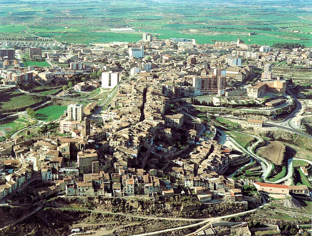 Vista aèria de la ciutat, amb el nucli històric a primer terme i la vall de l’Ondara al fons.
