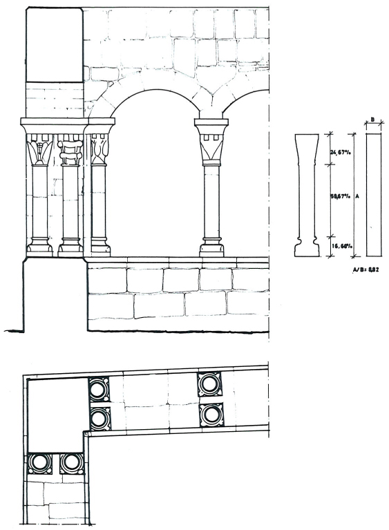 Planta i alçat d’un detall del claustre, amb la indicació de les proporcions i les mides de les columnes i l’esquema estructural de composició d’elements.