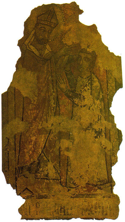 Presenta dues figures humanes, la d’un bisbe ataviat amb els induments propis i la d’un altre personatge que és beneït pel primer. L’estat de conservació no és gaire bo, ja que s’ha perdut qualsevol referència espacial o d’ambientació que pugui situar dins un context narratiu les figures. Sota els personatges corre un fris amb una inscripció de difícil lectura.