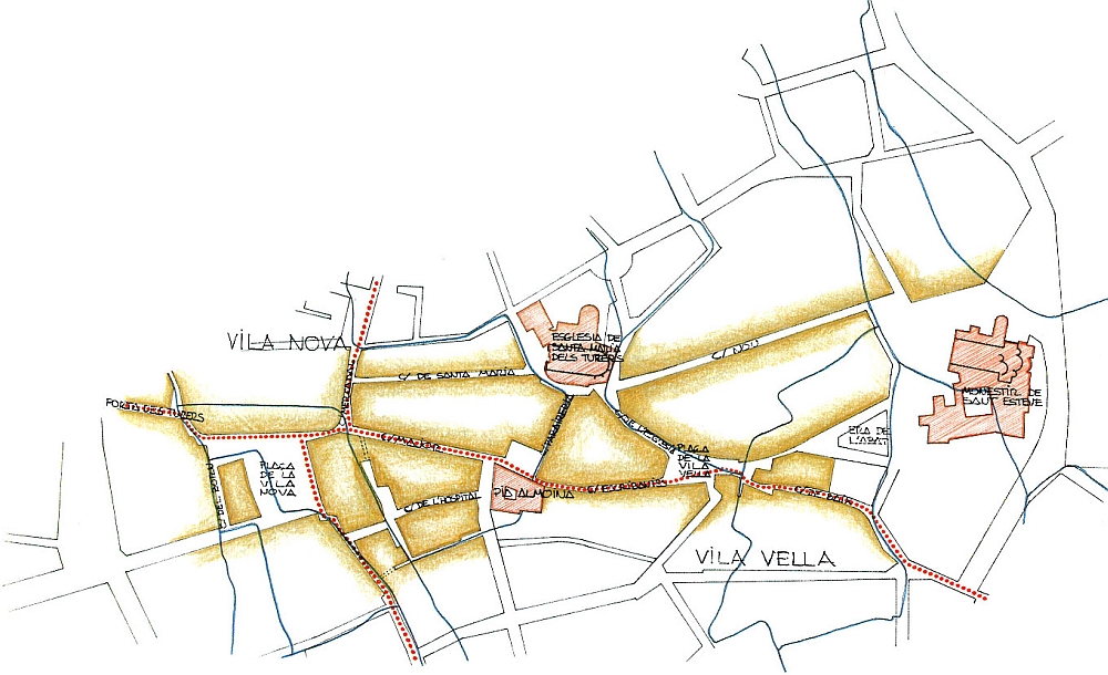 A l’ombra del naixent monestir s’anà poblant el que més endavant es va anomenar Vila Vella, entre el monestir i l’església de Santa Maria, en contraposició a la Vila Nova, urbanitzada a partir del segle XIII i que s’estén des de Santa Maria fins a la porta de Turers.