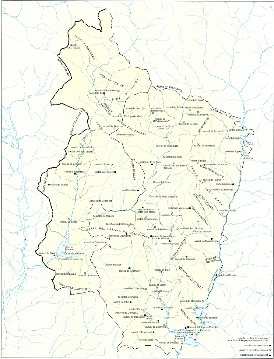 Mapa dels castells i altres edificacions militars de la Baixa Ribagorça anteriors al 1300.