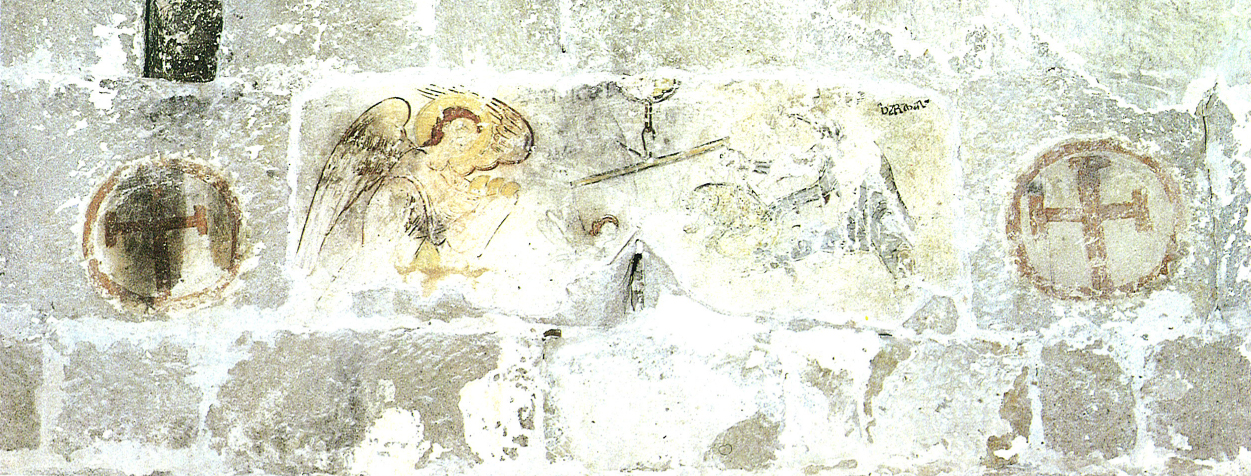 Un detall de la decoració mural amb una escena en la qual és representada una Psicòstasi, és a dir, el Pesament de les ànimes, amb sant Miquel i el Diable al costat d’unes balances. L’escena és flanquejada amb dues creus inscrites en cercles.