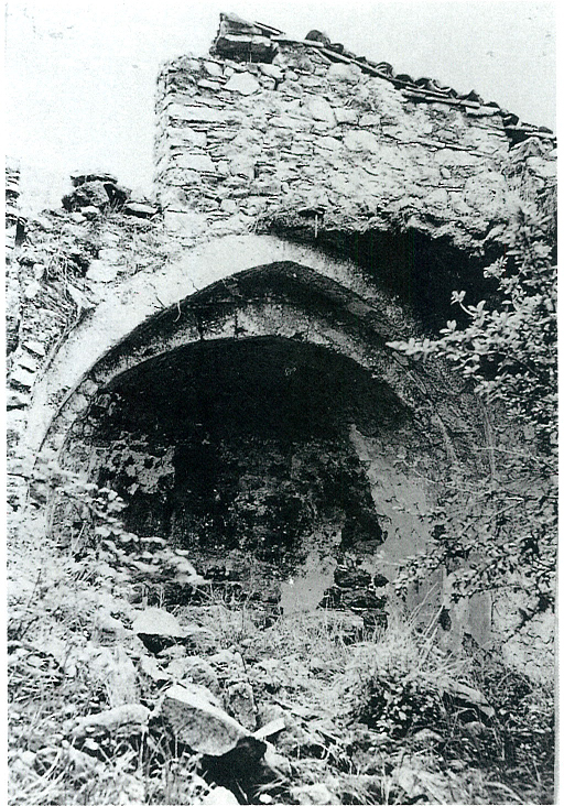 Vista interior del sector de capçalera d’aquesta església, totalment ensulsiada, amb l’obertura de l’absis precedida d’un arc presbiteral molt apuntat.