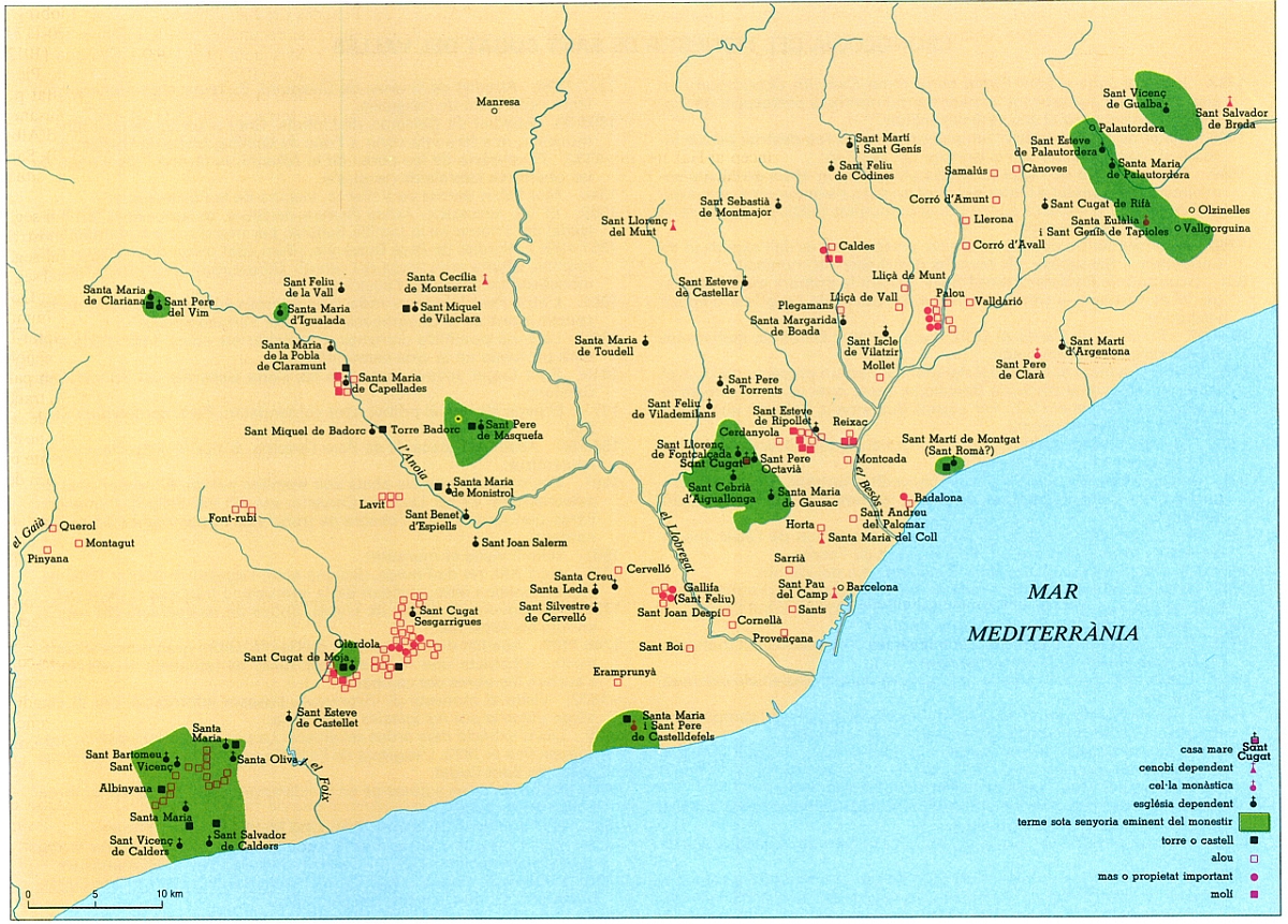 El mapa que adjuntem intenta mostrar de manera gràfica la gran quantitat de béns del cenobi, que s’estenien gairebé exclusivament pel comtat i bisbat de Barcelona, amb algunes extensions als territoris de la marca del Penedès i d’Osona. Efectivament, Sant Cugat va tenir un paper de primer ordre en la defensa i la repoblació de les fronteres dels comtats de Barcelona i d’Osona. Als segles X-XII Sant Cugat posseïa drets i generalment la senyoria eminent, almenys sobre set castells i cinc torres en les zones de marca, distribuïdes per les comarques del Baix Llobregat, l’Anoia, l’Alt Penedès i el Baix Penedès. Al Baix Llobregat el castrum de Castelldefels, documentat entre els anys 970-1179; a l’Anoia, els castells de Masquefa (998-1193) i Clariana (1012-1114), una torre a Capellades (1096) i la torre Badorc, de Piera (1186-1188); a l’Alt Penedès, el castell de Gelida (permutat pel de Masquefa el 998) i les torres de Mojà (1011-1187), Susanna (1109) i Monistrol (1125); i al Baix Penedès, els castells d’Albinyana (1011-1194), Santa Oliva (1012) i Calders (1037-1199). Sant Cugat també era el senyor vivent del castell de Montgat, situat fora de la marca.