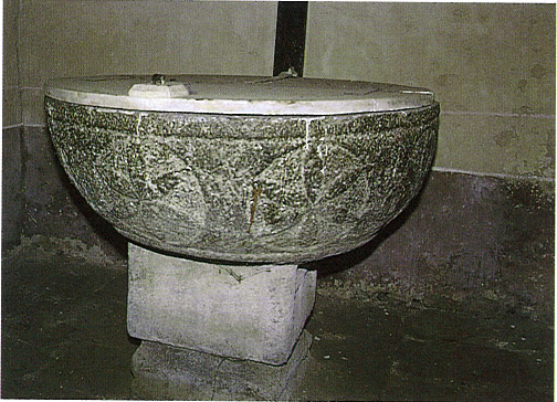 Pica baptismal conservada a l’interior de l’església amb una decoració de tipus geomètric.