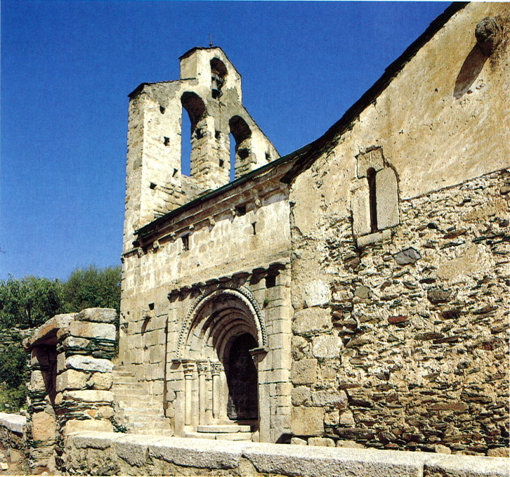 Aspecte del sector sud-est de l’església, un dels edificis més característics de l’arquitectura cerdana del segle XII, amb una àmplia profusió de mènsules i elements esculpits.