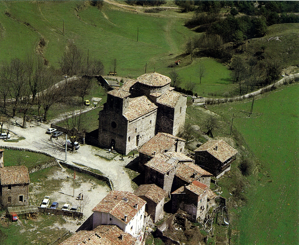 L’església des del costat de migjorn en una fotografia aèria. Hom pot veure l’equilibri de línies i proporcions d’aquest edifici que inspirà Elies Rogent per a la restauració, al començament del segle XX, de l’església del monestir de Ripoll.