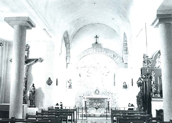 Interior de l’església amb l’absis, l’arc presbiteral i dos arcs formers d’estructura romànica.