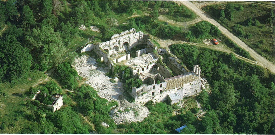 Un aspecte de les ruïnes del monestir des del costat de ponent. A mà esquerra la façana de l’església.