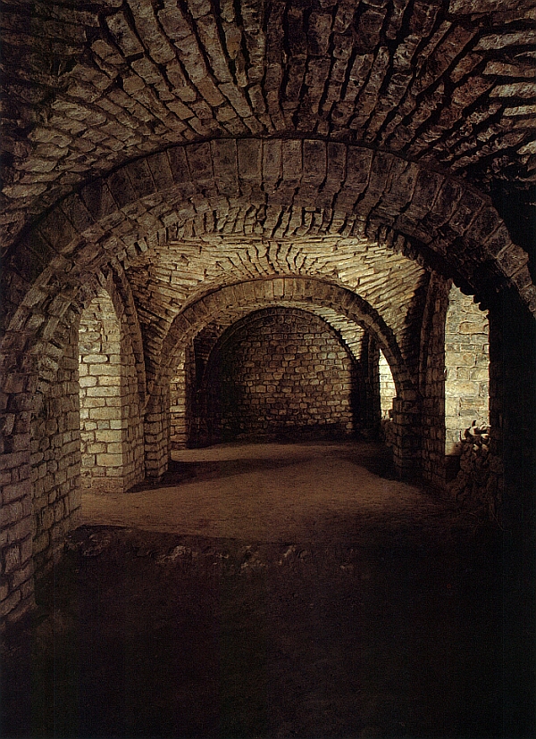 Pel que fa a les estructures arquitectòniques, el panorama sembla similar, i creiem que no es produeixen canvis respecte a l’etapa anterior. D’aquesta manera podem afirmar que la segona fase de l’edifici de l’església es caracteritza per la continuïtat. Els paviments en treballs es toquen, les portes segueixen en ús i les parets no es modifiquen. Solament falta resoldre el problema de la volta de separació entre el soterrani i el pis superior. A les naus laterals la qüestió és clara car, com de seguida veurem, les voltes estan datades i són tardanes. En canvi, a l’espai central, els caràcters estilístics de la volta entre pisos són més antics; es tracta d’una coberta en aresta limitada per arcs torals i realitzada amb un aparell tosc, del qual s’eliminà qualsevol resta d’enlluït mitjançant una altra neteja moderna.