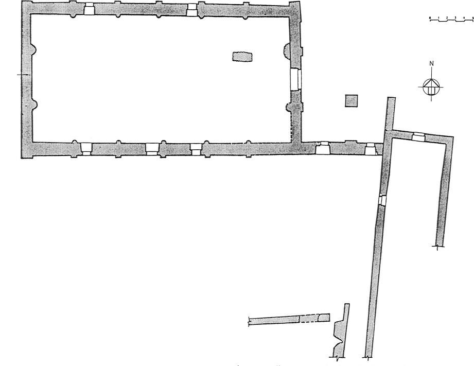 Pel que fa al mur que uneix les dues capelles, s’ha de dir que limita un espai bastant gran entre l’acabament de la nau central i les capelles. Aquest espai s’ha trobat reblert de terres amb ceràmiques grises no gaire tardanes, la qual cosa fa pensar que el mur en direcció nord-sud, encara que es troba a tocar de les capelles, no és gaire més tardà, i que, una vegada construïdes aquestes estructures, fou habilitat un espai pla i ample entre les dues que probablement tenia un pòrtic.