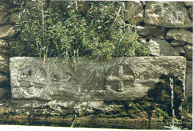 Sarcòfag procedent de l’església i avui emprat com a font, que encara mostra algunes creus en relleu que el decoraven.