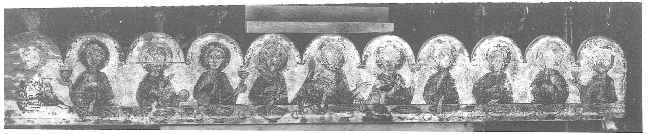 La cresteria, que fa 187 cm de llarg i 25 cm d’alçària, és una peça que presenta onze arcs semicirculars a la part superior i que s’acoblava sobre la part també superior de la biga. En força mal estat de conservació, la decoració a la part davantera encara mostra la representació d’un sant sopar que segueix les pautes iconogràfiques habituals a l’edat mitjana. Jesús presideix la taula al centre de la composició amb un grup de cinc apòstols a cada costat, tot coincidint cadascun d’ells sota d’una arcada. Joan, recolzat sobre Jesús, ocupa la mateixa arcada que aquest; Judes, davant de la taula, rep de Jesús un tros de pa. Sobre la taula i davant de cadascun dels apòstols hi ha un plat amb un peix, una copa i trossos de pa. Exceptuant Joan i Judes, els apòstols estan en actitud de menjar, amb copes al davant o ganivets a les mans. Alguns dels paral·lels iconogràfics importants d’aquesta representació són en els conjunts murals de Santa Maria de la Seu d’Urgell (MEV) i de Sant Andreu d’Angostrina (l’Alta Cerdanya).