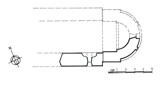 Planta de l’església en la qual s’indica la part de la construcció que encara resta parcialment en peu.